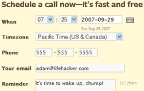Wakerupper.com是一个免费的设定语音闹钟的网站,输入对方的手机号码,闹钟时间和信息提示内容……不过网站只支持美国地区的手机,但愿你有朋友在美国享受你的折磨吧……但貌似网站太多人访问,老是说忙。